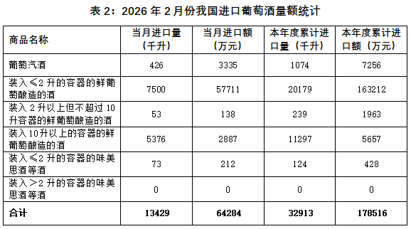 當(dāng)月表現(xiàn):葡萄酒2月進口量1.34萬千升,進口額6.43億元。其中,裝入≤2升容器的鮮葡萄釀造酒為主要品類,進口量7500千升,進口額5.77億元;裝入10升以上的容器的鮮葡萄釀造的酒進口量5376千升,進口額2887萬元。