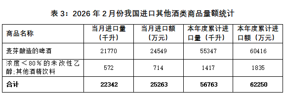 累計表現(xiàn):1-2月啤酒及其他酒精飲料累計進口量5.68萬千升,累計進口額6.23億元。