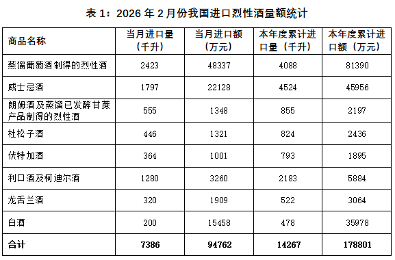 2026年2月,中國酒業(yè)協(xié)會監(jiān)測的16類主要進口酒類商品(含白酒)進口量4.34萬千升,進口額19.98億元(人民幣計,下同);1-2月累計進口量10.44萬千升,進口額45.55億元。