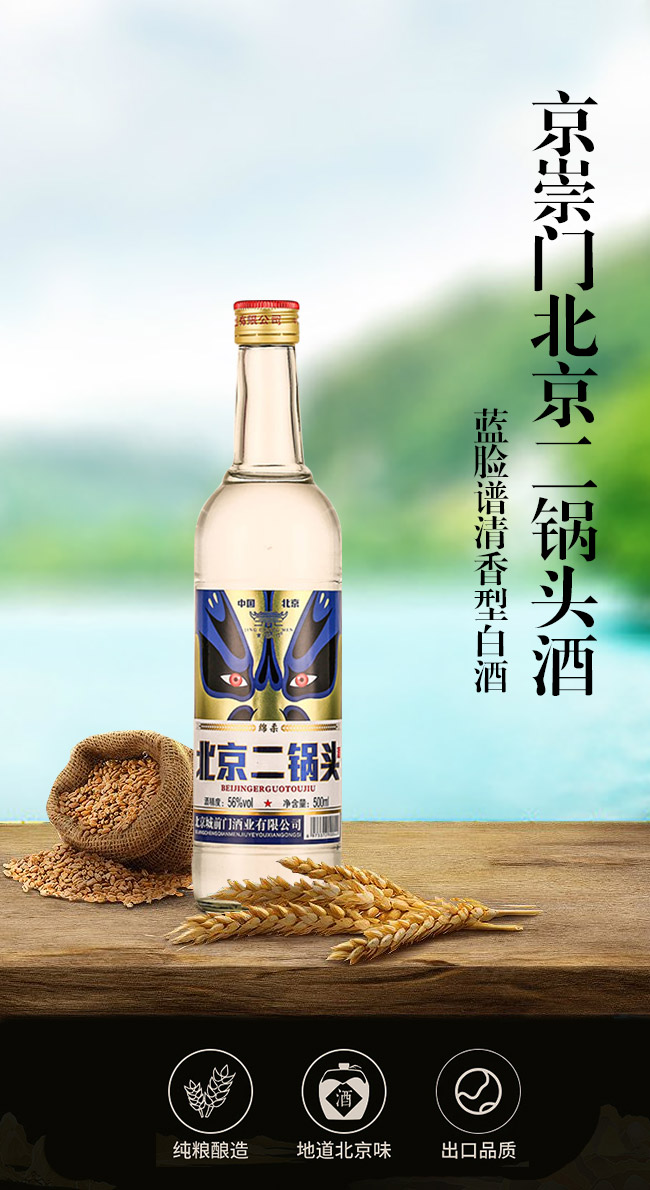 【產(chǎn)品名稱(chēng)】京崇門(mén)北京二鍋頭酒藍(lán)臉譜清香型白酒【42°56°500ml】