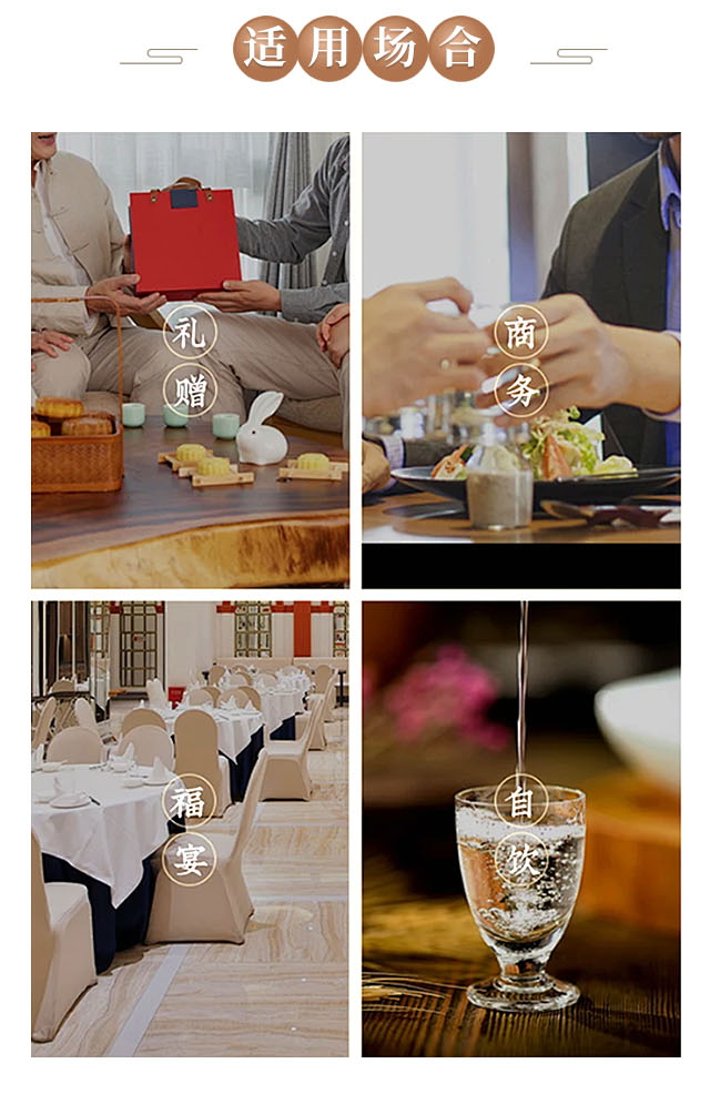 適飲場合:商務(wù)宴會、團圓小酌、婚慶宴席、節(jié)日送禮、收藏