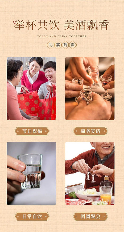 適飲場(chǎng)合:商務(wù)宴會(huì)、團(tuán)圓小酌、婚慶宴席、節(jié)日送禮、收藏等