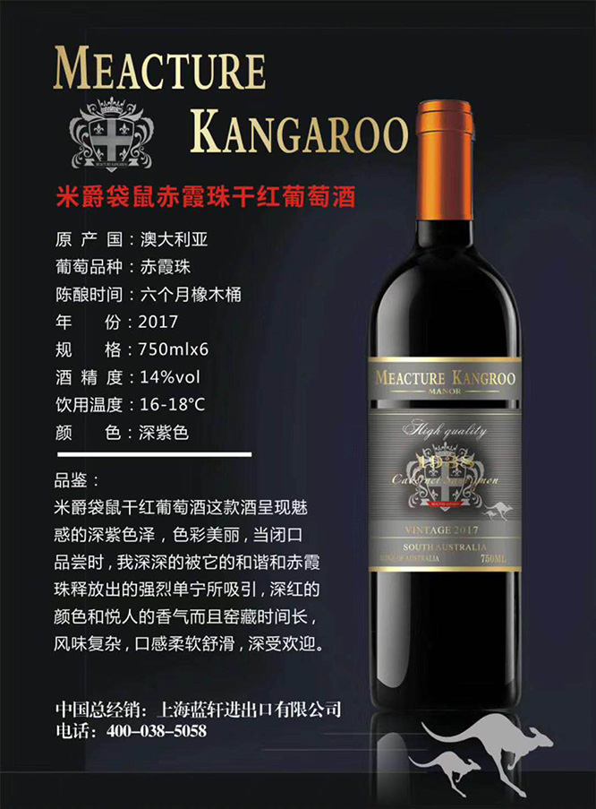 產(chǎn)品名:米爵袋鼠赤霞珠干紅葡萄酒14°750ml