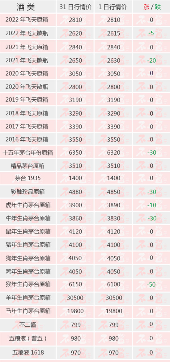 4月1日茅臺酒行情價總體呈現(xiàn)跌價態(tài)勢。飛天方面,2022年散瓶小跌,有5元/瓶的跌價;2021年散瓶跌價20元/瓶。生肖方面,虎年、牛年分別有10元/瓶、30元/瓶的跌幅。其他系列中,十五年跌價30元/瓶。另外新增彩釉珍品報價,今日跌價30元/瓶,報4850元。