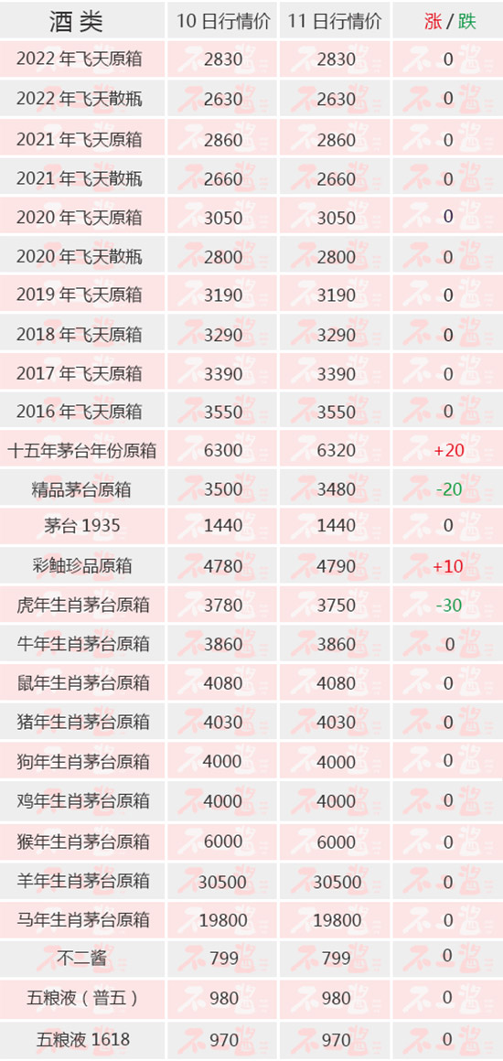4月11日茅臺酒行情價基本維持穩(wěn)態(tài)。飛天方面均未有動價。生肖方面,虎茅持續(xù)跌價,今日跌價30元/瓶。其他系列中,十五年漲20元/瓶,精品跌20元/瓶,彩釉珍品小漲10元/瓶。