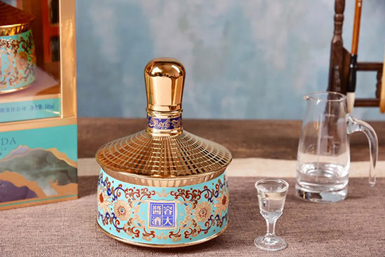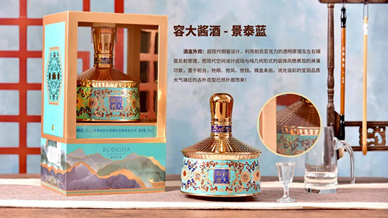 在瓶身上,容大醬酒景泰藍(lán)仍然延用容大藍(lán)色為底色,以金邊纏枝寶相花花紋纏繞瓶身,以仿景泰藍(lán)掐絲工藝為藍(lán)本,整個瓶身充滿質(zhì)感,造型典雅雄渾、紋樣繁富、色彩清麗莊重,給人以圓潤堅實、細(xì)膩工整、金碧輝煌、繁花似錦的藝術(shù)感受?捎谩靶、紋、色、光”四字來概括。具有鮮明的民族風(fēng)格和深刻文化內(nèi)涵,是具北京特色的傳統(tǒng)手工藝品,正所謂“美酒盛美器,美不勝收。