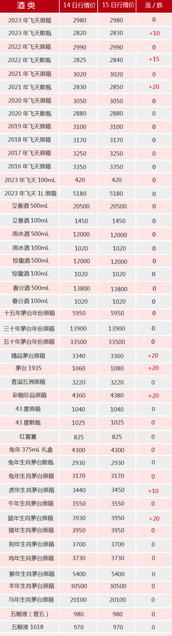 5月15日茅臺酒行情價繼續(xù)上漲。飛天方面,2021~2023年散瓶有10~20元/瓶的漲幅;生肖方面,虎年、鼠年漲10~20元/瓶;其他系列中,精品茅臺、茅臺1935、彩釉珍品均漲20元/瓶。