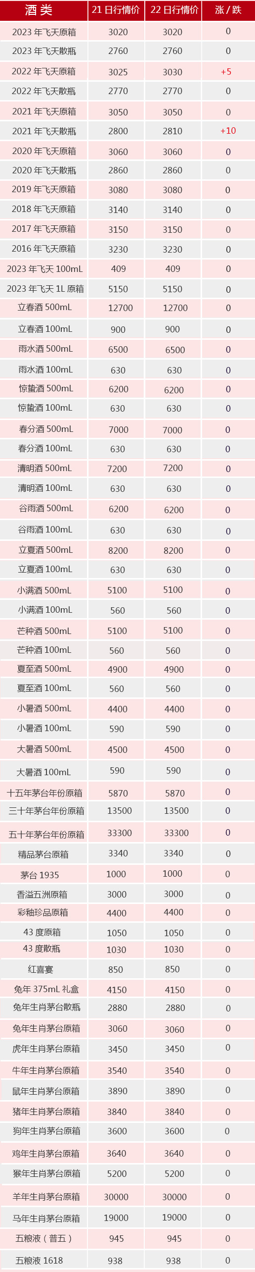 9月22日茅臺行情價。飛天方面,2022年原箱和2021年散瓶漲5~10元/瓶;生肖方面和其他系列無動價。
