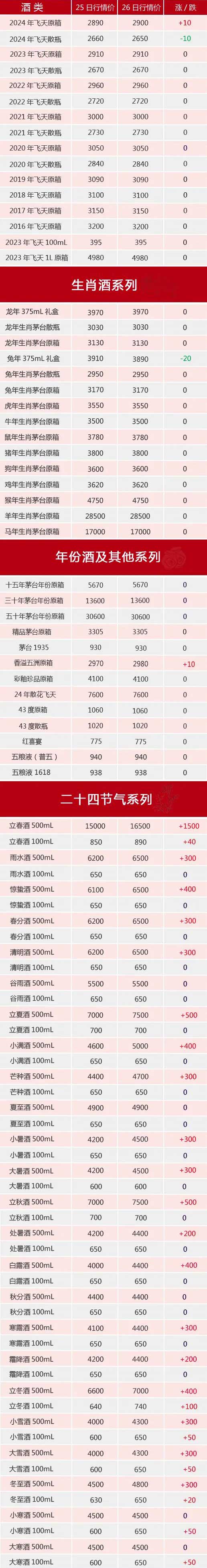 茅臺(tái)酒行情價(jià):飛天方面,2024年原箱漲10元/瓶,2024年散瓶跌10元/瓶;生肖方面,兔年禮盒跌20元/瓶;其它系列,香溢五洲漲10元/瓶,多款大節(jié)氣酒漲200~1500元/瓶,多款小節(jié)氣酒漲20~100元/瓶。